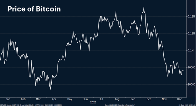 Bitcoin, while only down 5% for calendar year 2025, has plummeted from its peak just two months ago, falling almost 30%. Although investing in currencies (any currency) has not been a priority for BCWM, we clearly try to avoid investments that produce no cash flow (dividends or interest). We also try to avoid “investments” that have the potential to drop 30% in less than two months.